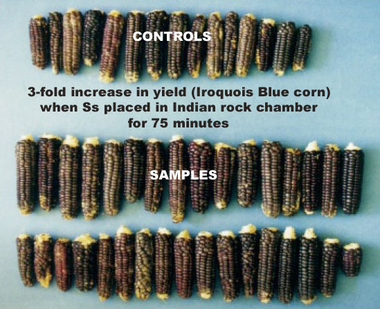 Below, forty seeds of "Iroquois Blue Flint" corn which had been placed inside a Native American rock chamber with highly magnetic stone roof-slabs not only grew almost 100% faster than 40 controls, they produced three times as much corn, by weight.